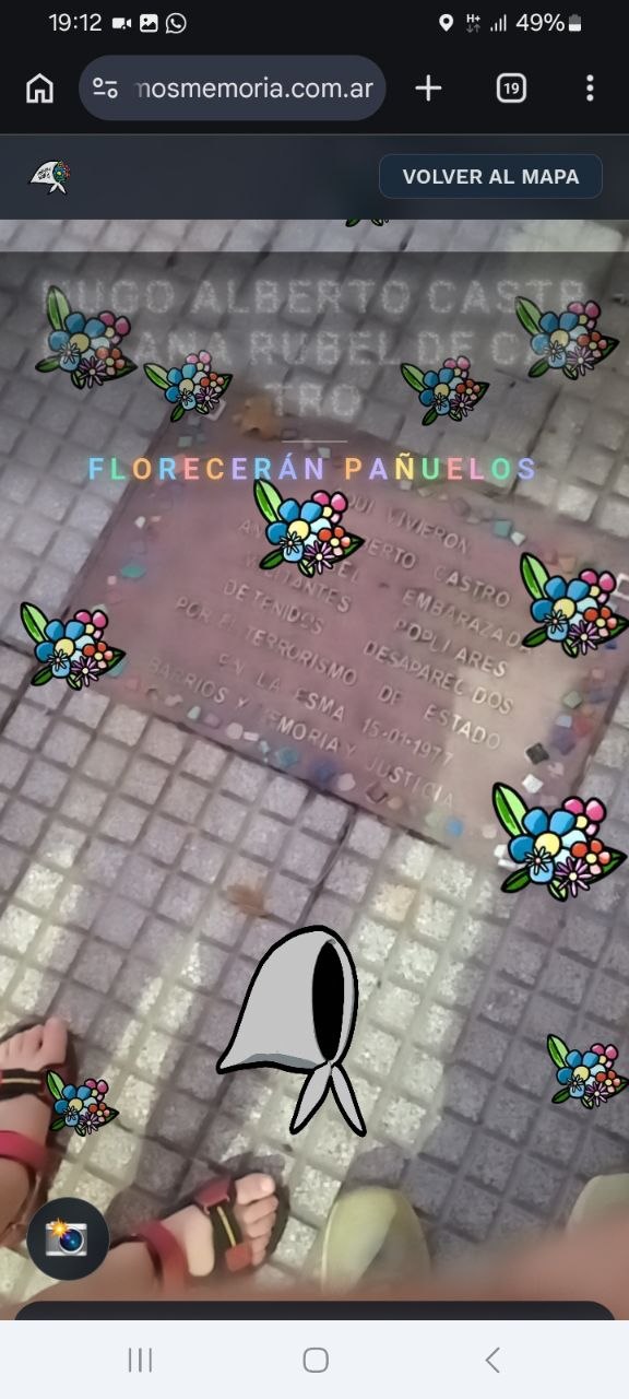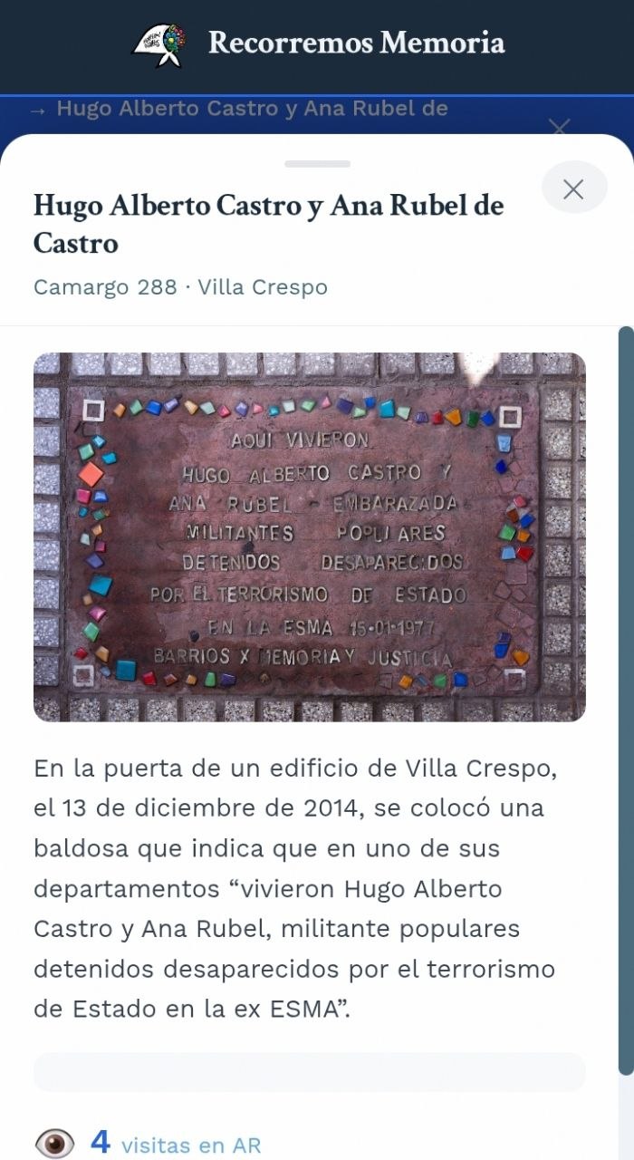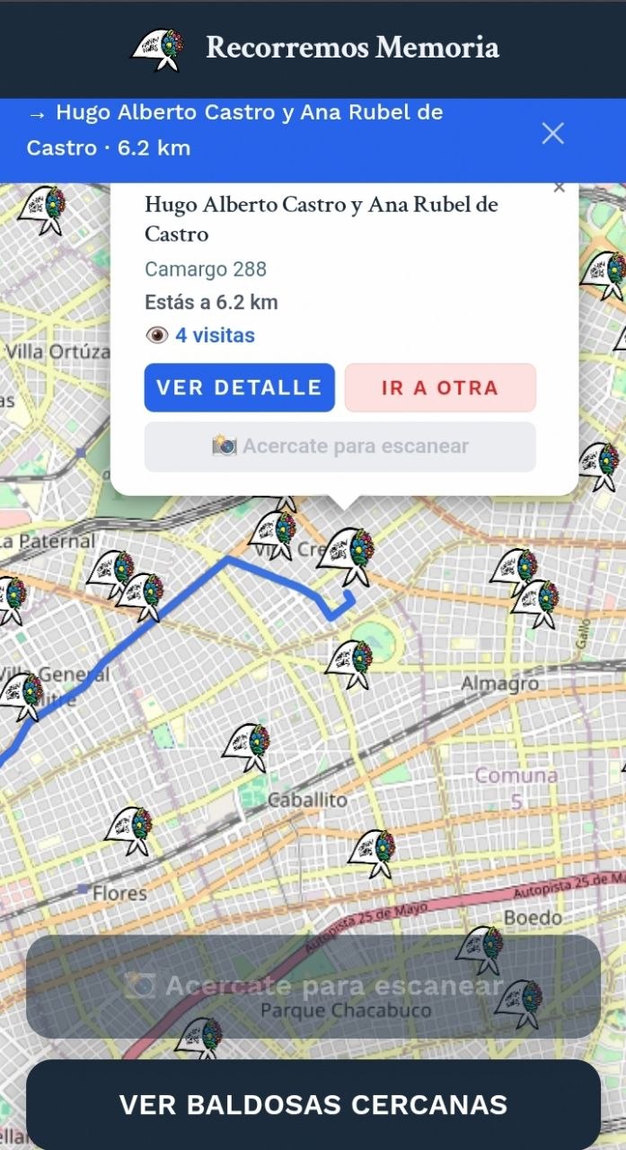 Cuando estás cerca (menos de 50 metros) te permite escanear la baldosa. Al escanearla se agrega una nueva visita y ves la escena interactiva que podés guardar de recuerdo.